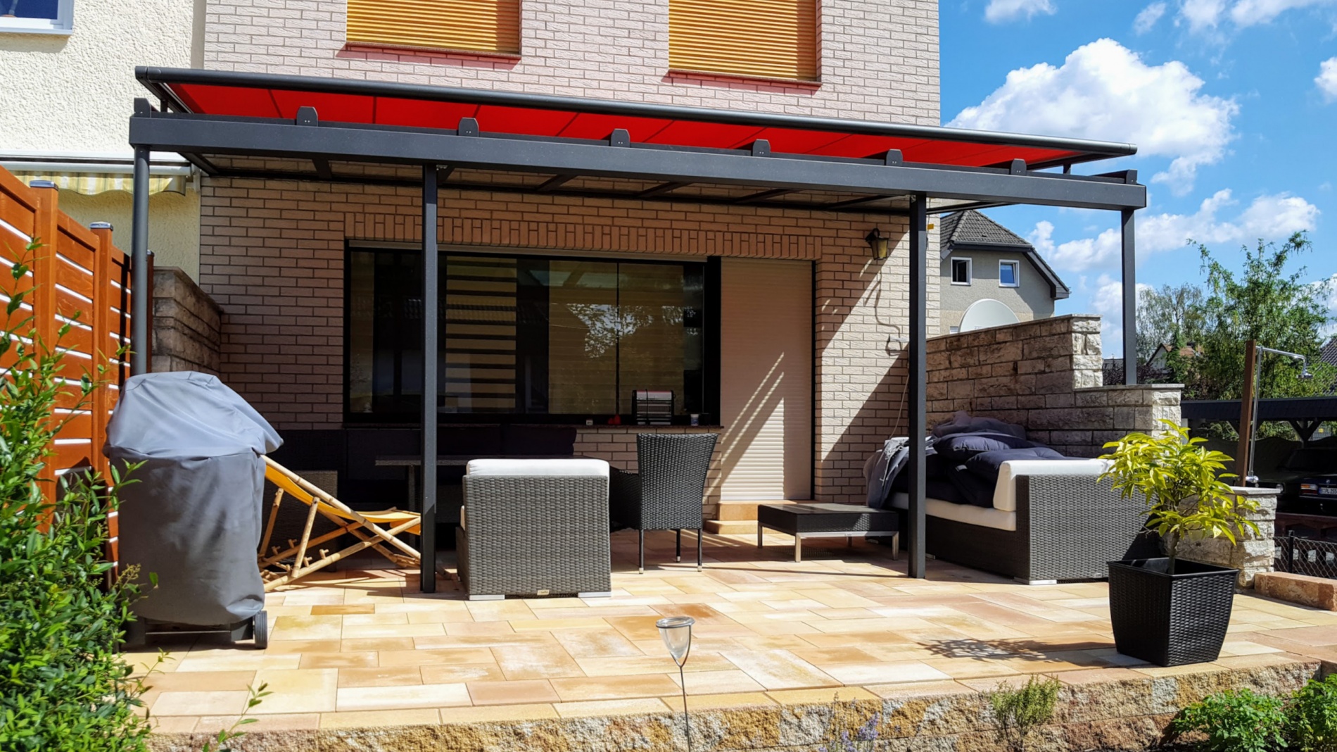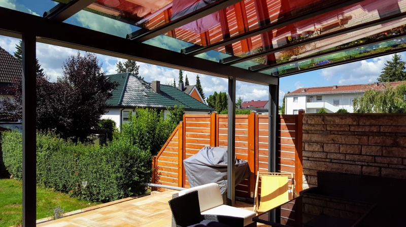 Wintergartendachmarkise mit seitlichen Führungsschienen, Gehäuse und Führungsschienen in Sonderfarbe RAL 7016, E-Antrieb, Becker-Funkempfänger, Funkhandsender...