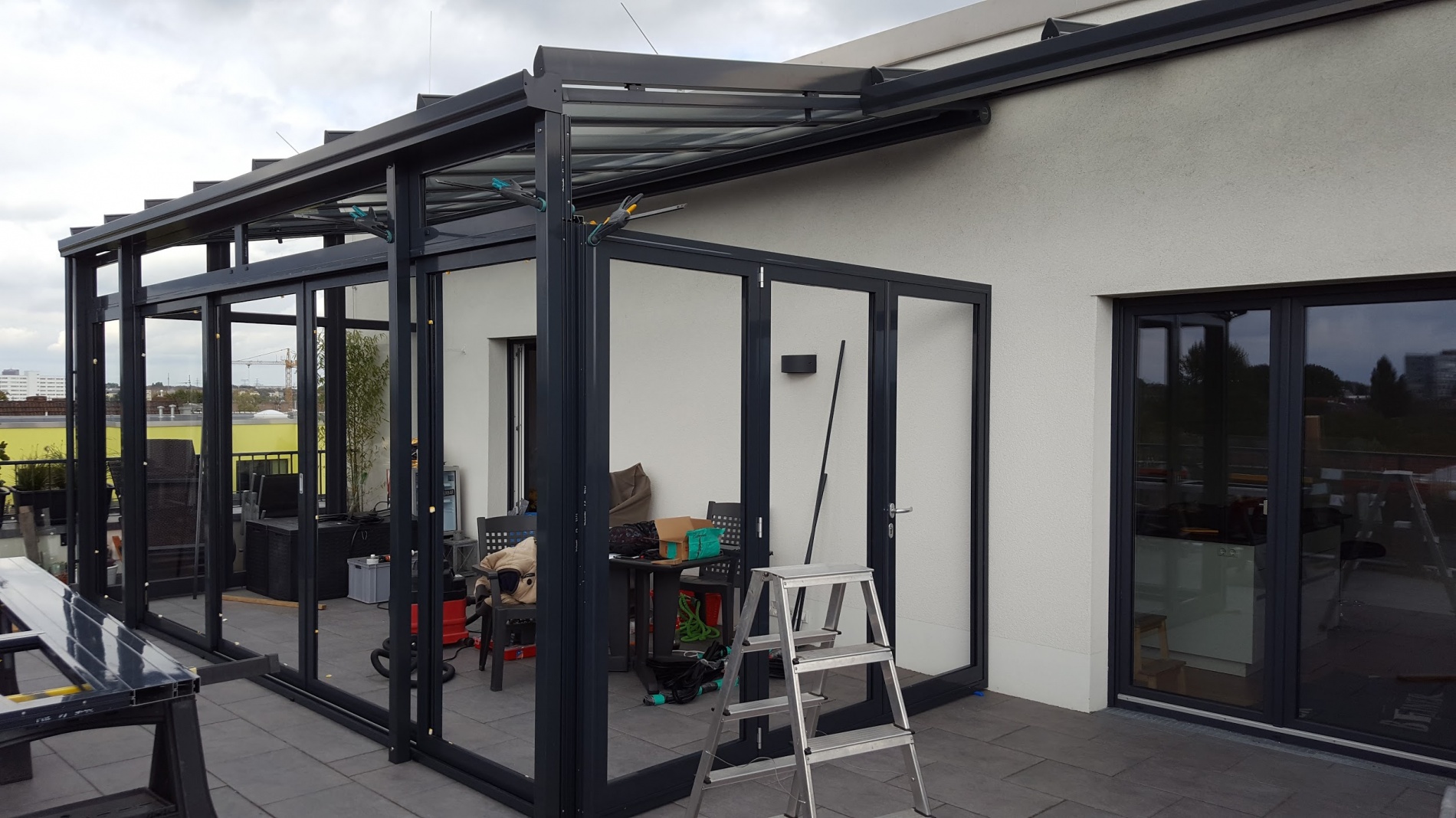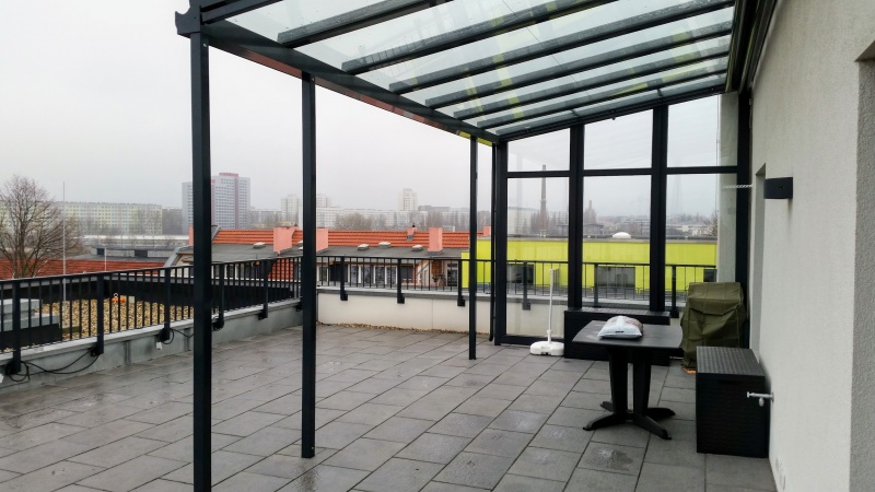 Dach und Stützen aus Alu, zahlreiche Dachformen wie Pult-, Walm-, Satteldach, Dacheindeckung wahlweise Kunststoff-Stegplatte oder VSG 10mm, Standardfarbe RAL 9016 weiß, seidenmatt, alternativ jeder RAL-Ton, auch in feinstruktur, lieferbar. Einbau von Fensterelementen oder Glasschiebetüren mit oder ohne Rahmen, auch nachträglich, möglich.