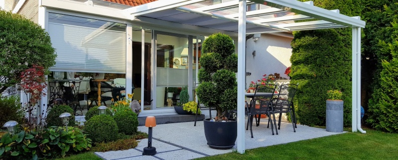 Dachprofile, Stützen weiß, Dacheindeckung Polycarbonat-Stegplatte.