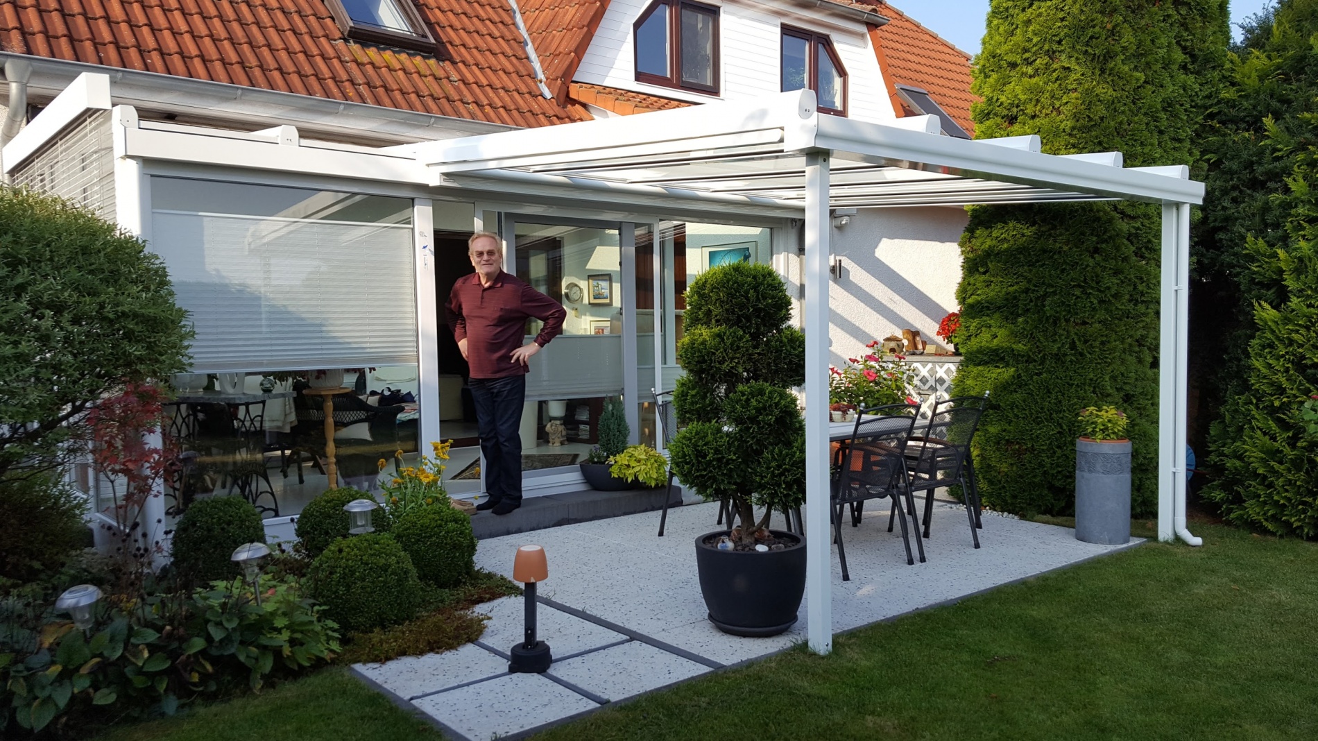 Dach und Stützen aus Alu, zahlreiche Dachformen wie Pult-, Walm-, Satteldach, Dacheindeckung wahlweise Kunststoff-Stegplatte oder VSG 10mm, Standardfarbe RAL 9016 weiß, seidenmatt, alternativ jeder RAL-Ton, auch in feinstruktur, lieferbar. Einbau von Fensterelementen oder Glasschiebetüren mit oder ohne Rahmen, auch nachträglich, möglich.