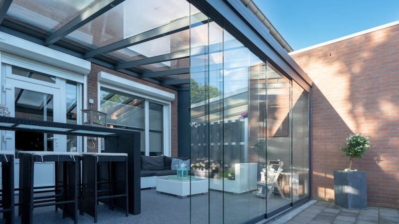 Dach und Stützen aus Alu, untenliegende Dachstatik, Dachdeckung Polycarbonat-Stegplatte, Standardfarben RAL 9016, 7016..., wahlweise Fensterelemente, Schiebetüren mit oder ohne Rahmen, LED-Beleuchtung, auch später nachrüstbar.