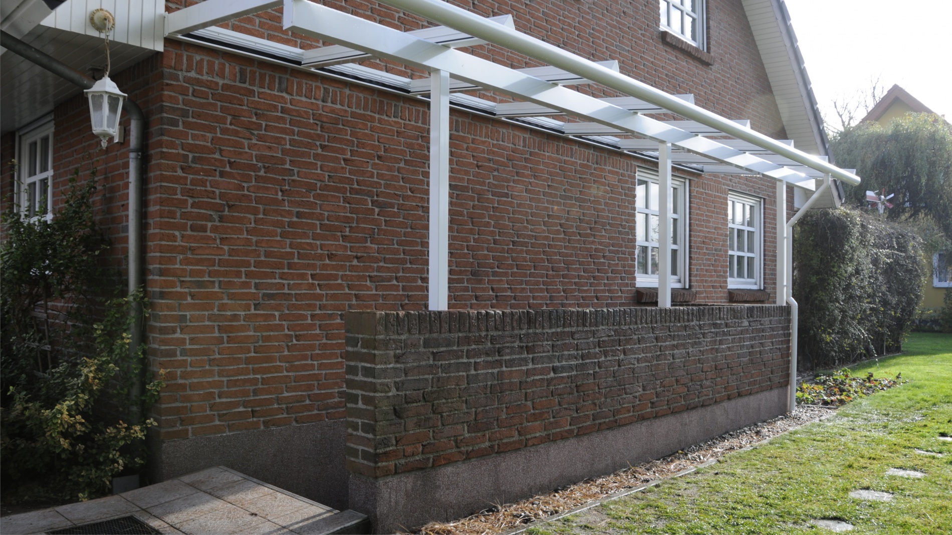 Dachprofile, Stützen weiß, Dacheindeckung Polycarbonat-Stegplatte.