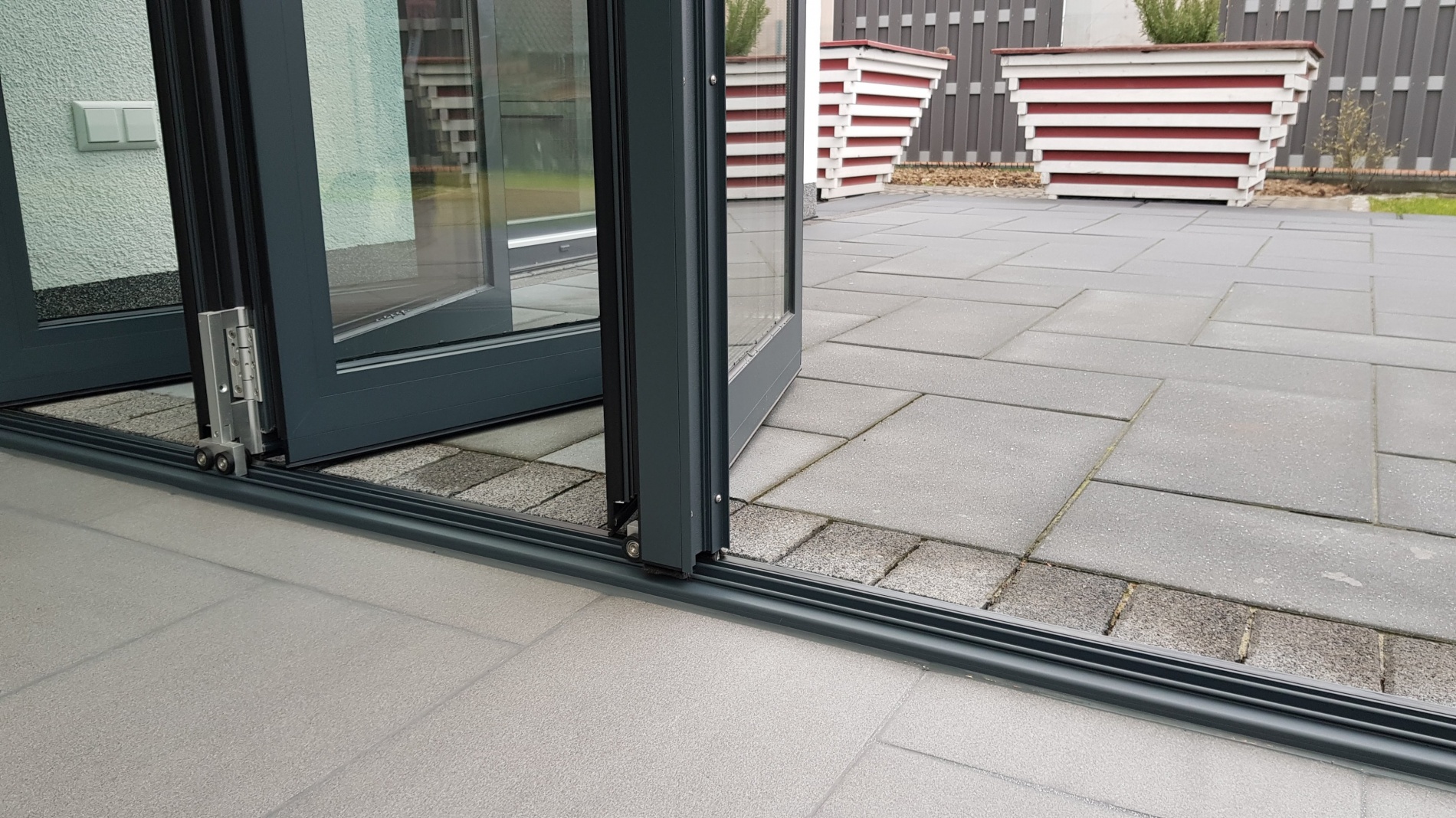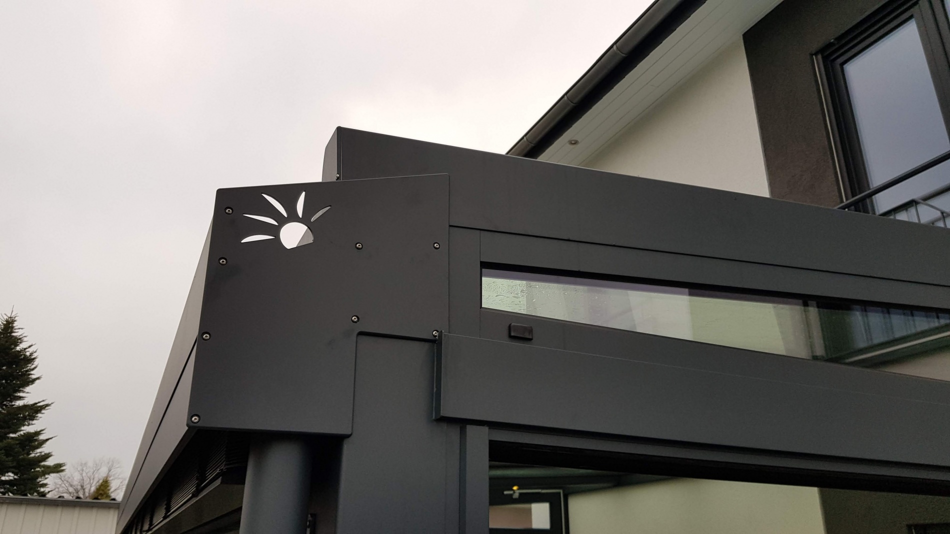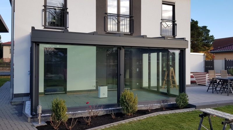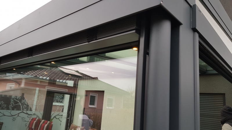 Dach und Stützen Alu, Fenster Kunststoff. Extras: Dach in Sonderfarbe, Fenster farbig foliert, Alu-Falttüren, Front mit integrierten Jalousien, Haustür mit Stoßgriff außen und Drücker innen, flache Schwellen, LED-Beleuchtung, Übergroße Front- und Seitenverglasung, Dreifachverglasung...
