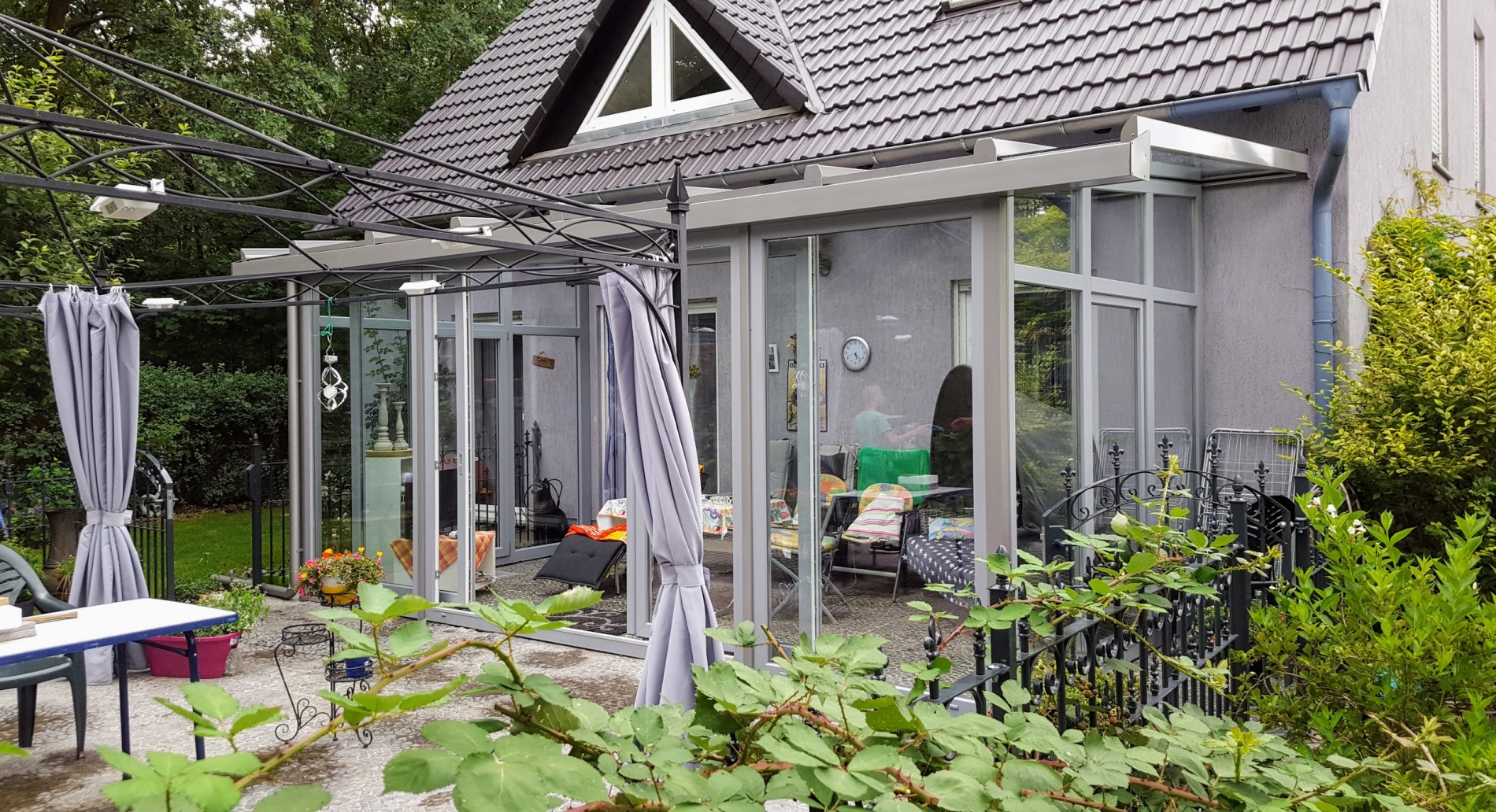 Dach und Stützen Alu, Fenster Kunststoff. Extras: Dach in Sonderfarbe, Fenster in Sonderfarbe foliert, Dach mit Sonnenschutzverglasung, Front mit Parallel-Schiebe-Kipp-Türen, Seiten mit Dachüberstand, besonders hohe Frontfensterbehind it.