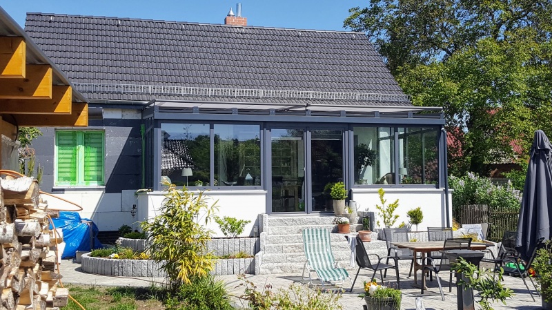 Dach und Stützen Alu, Fenster Kunststoff. Extras: Dach in Sonderfarbe, Fenster in Sonderfarbe foliert, Dach mit Sonnenschutzverglasung, Dach mit Dreifachverglasung, Fenster mit Dreifachverglasung, Innenbeleuchtung mit LED mit Funkempfänger und Handsender, Dachmarkise.