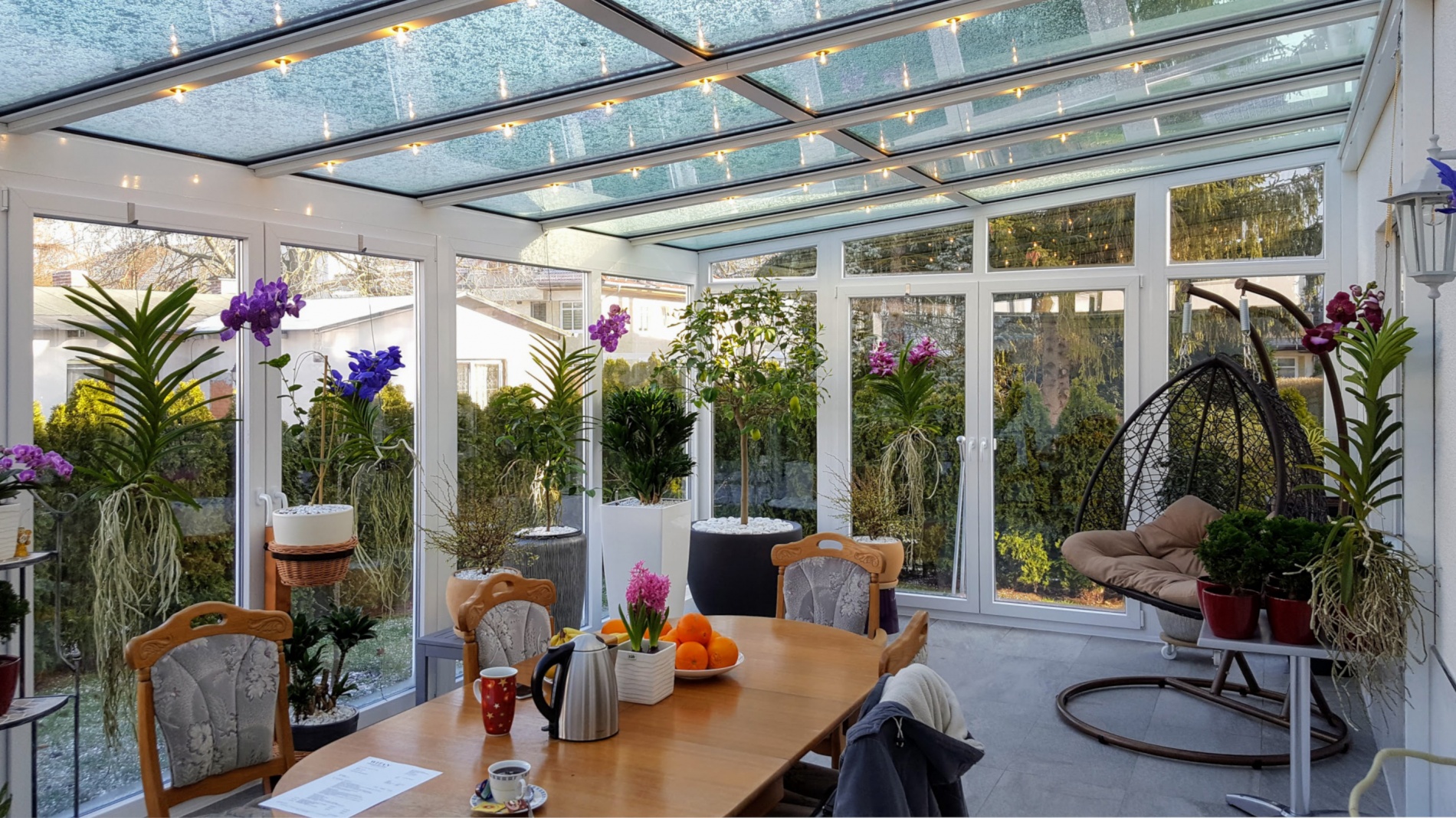 Dachprofile, Stützen und Fenster weiß, linke, rechte Seite sowie Front je eine Dreh-Kipp-Tür, Dacheindeckung Polycarbonat-Stegplatte.