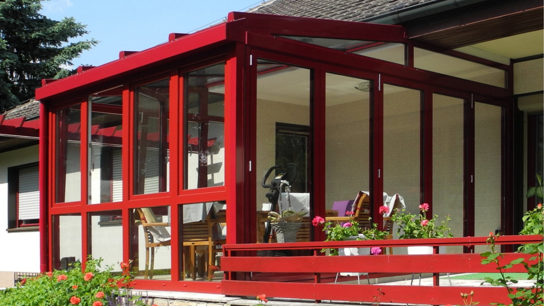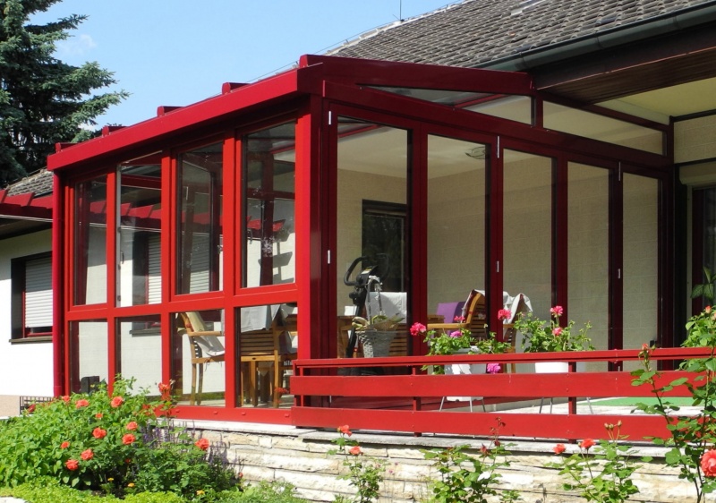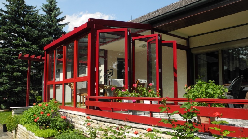 Dach und Stützen Alu, Fenster Alu. Extras: Dacheindeckung mit Sonnenschutzverglasung. Dach und Fenster in Sonderfarbe, Front mit Alu-Falttüren, Seiten mit waagerechten Kämpfersprossen...