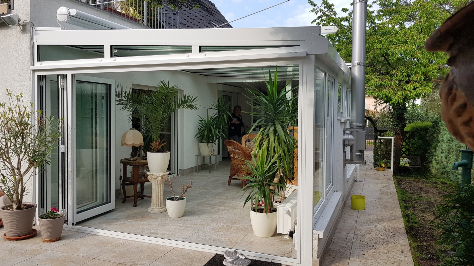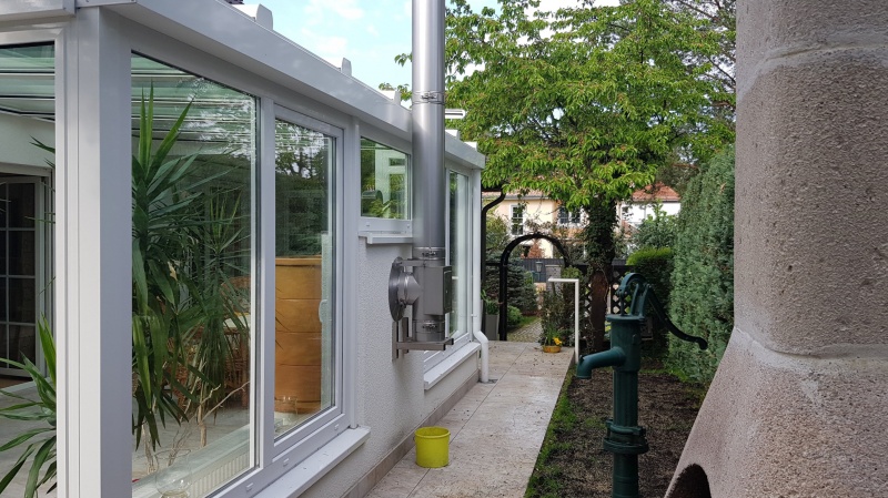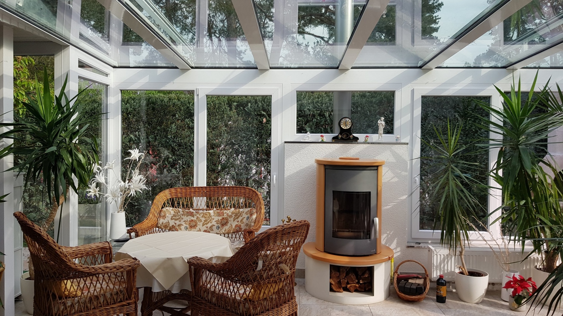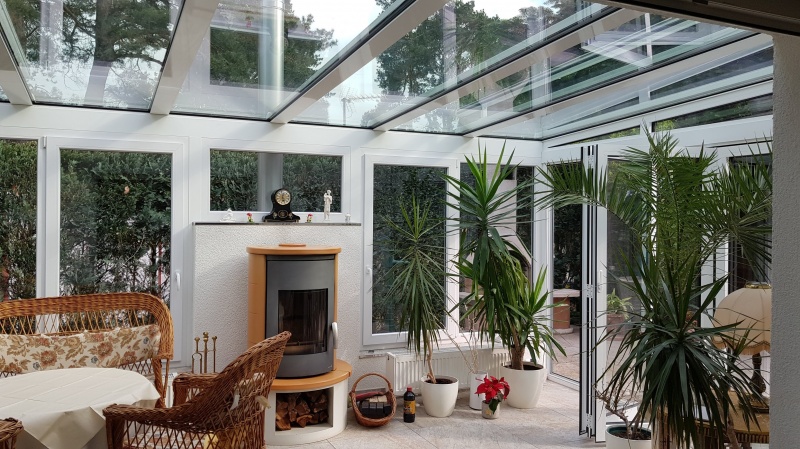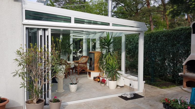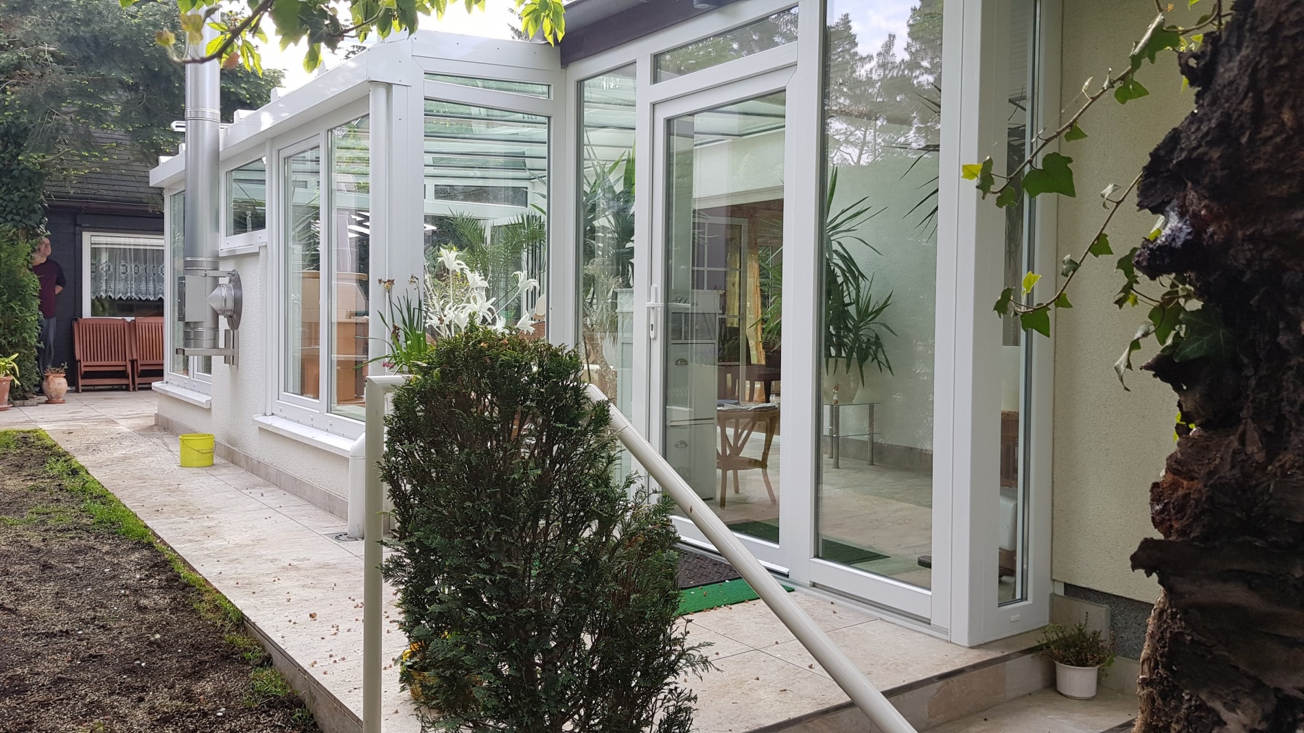 Dach und Stützen Alu, Fenster Kunststoff. Extras: Dachverglasung mit Sonnenschutz, Wintergartendachmarkise mit Funkempfänger und Funkhandsender, Rechte Seite mit Haustür, Hauseingang in Wintergarten integriert, Front mit gemauertem Sockel, Kamin, linke Seite mit Alu-Falttür.